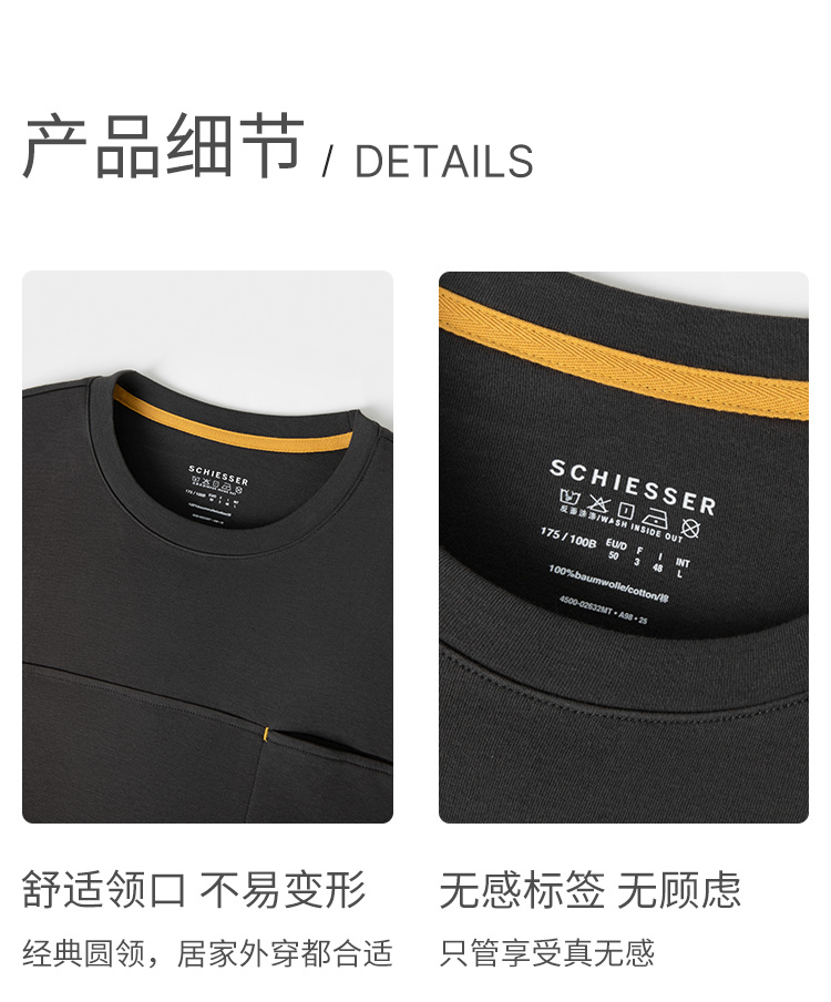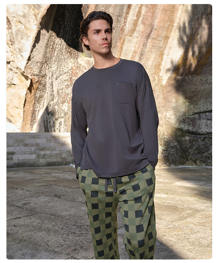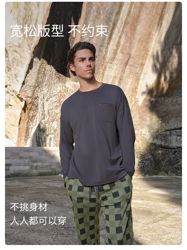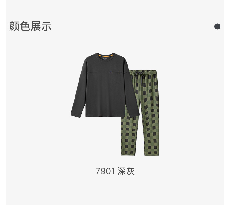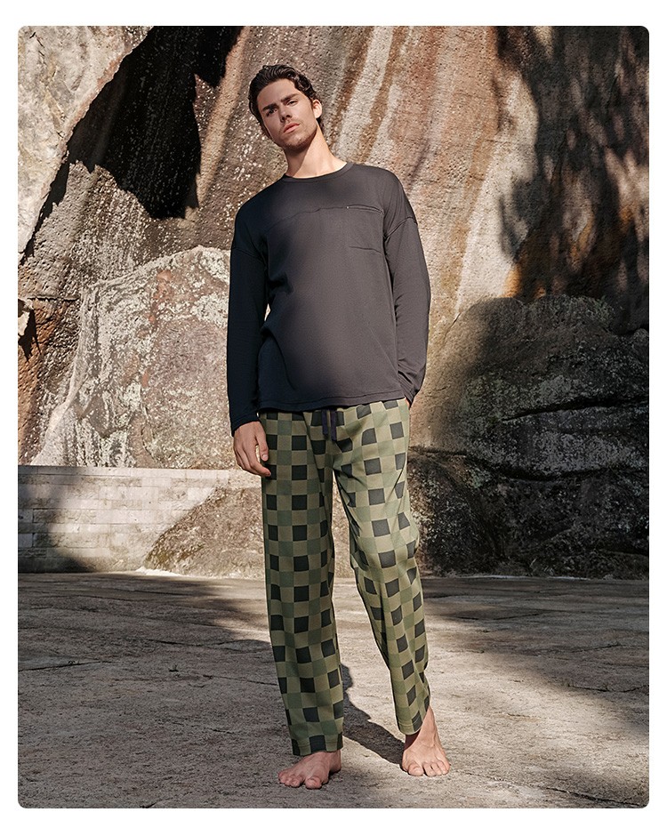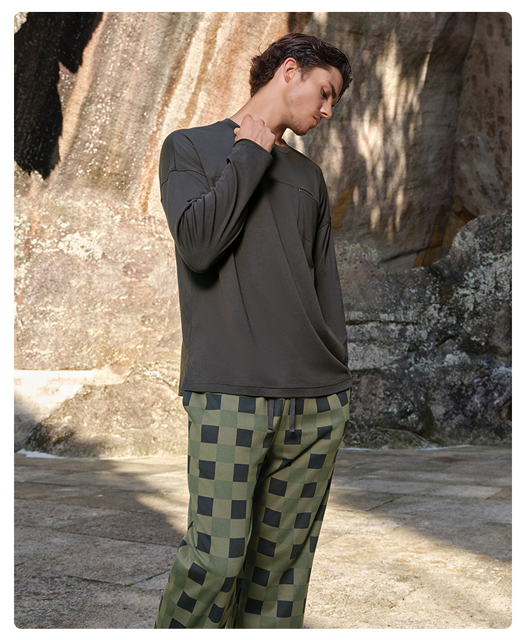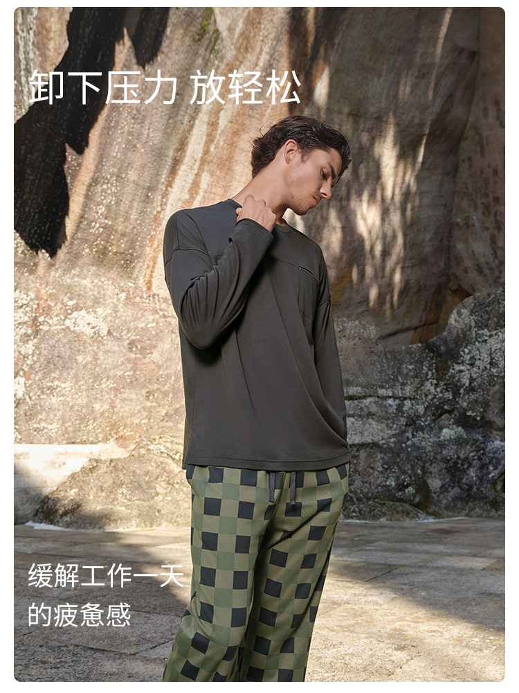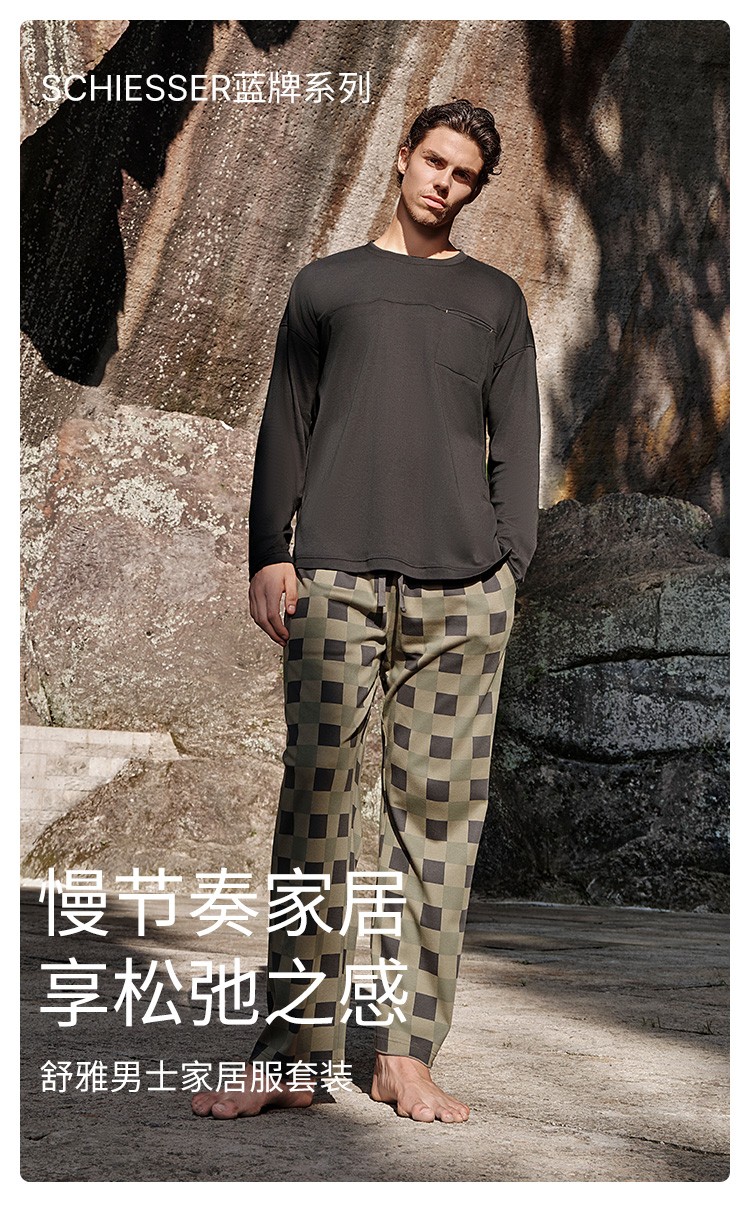 SCHIESSER舒雅25早秋新品男士纯棉棋盘格圆领大码睡衣家居服套装