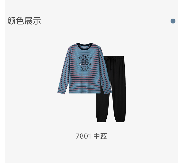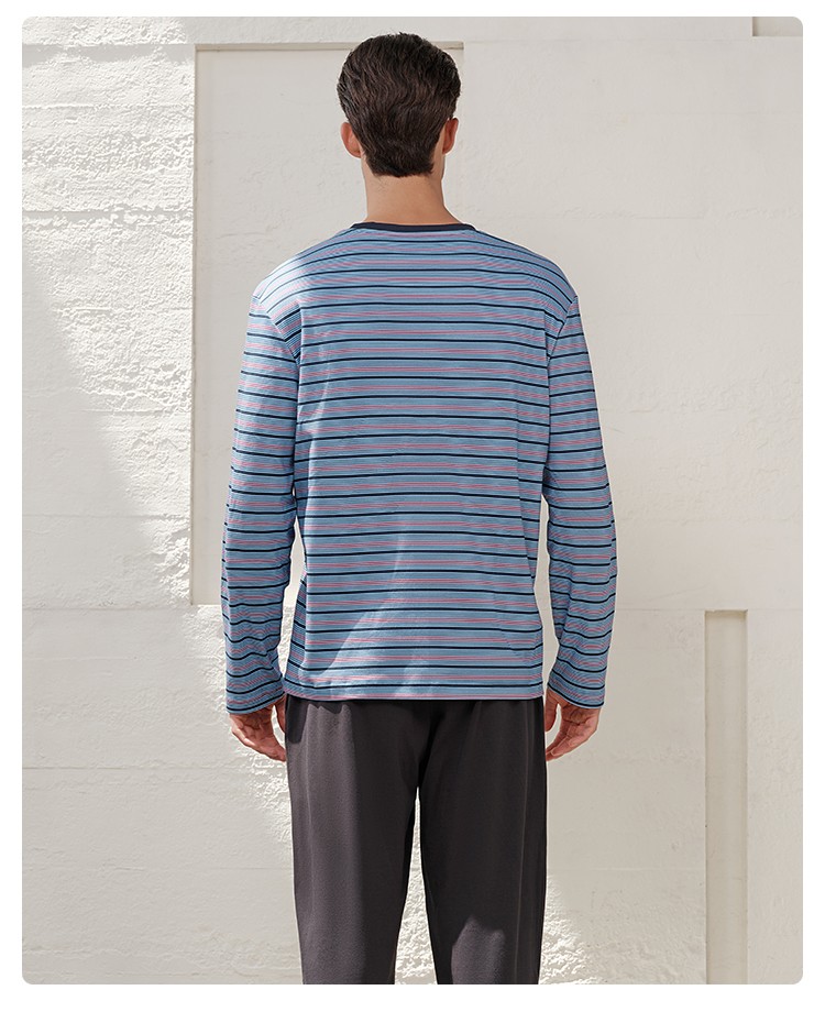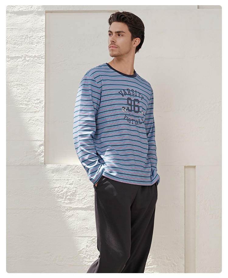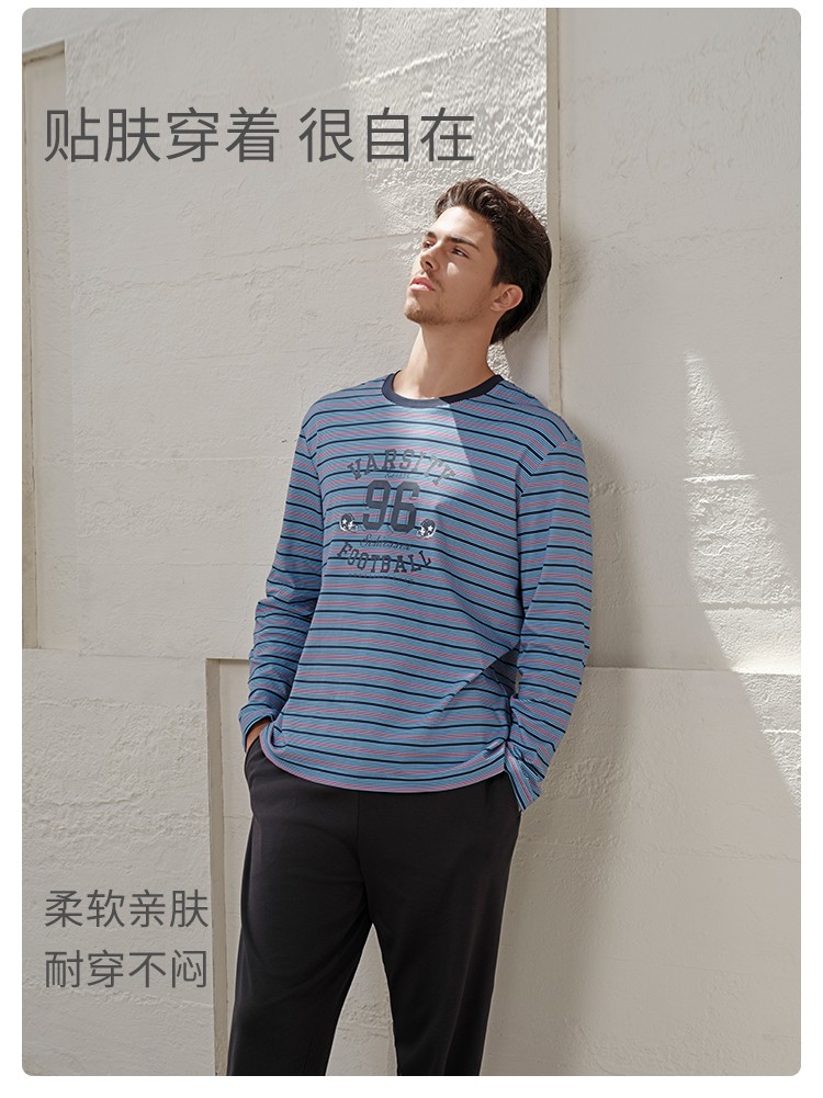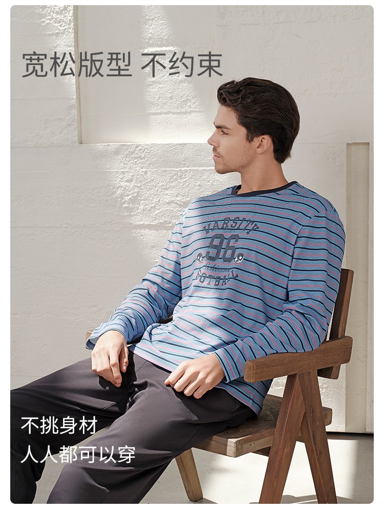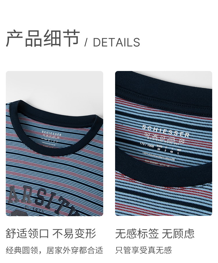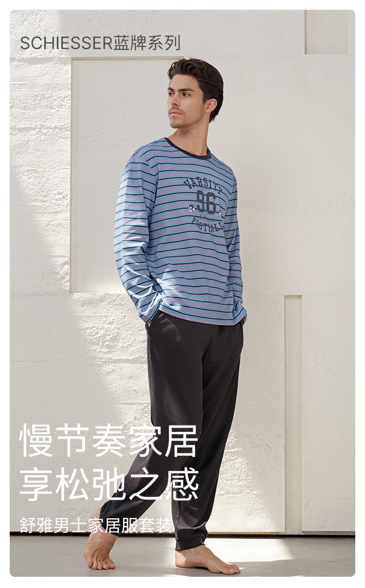 SCHIESSER舒雅25年早秋新品男士纯棉条纹圆领大码睡衣家居服套装