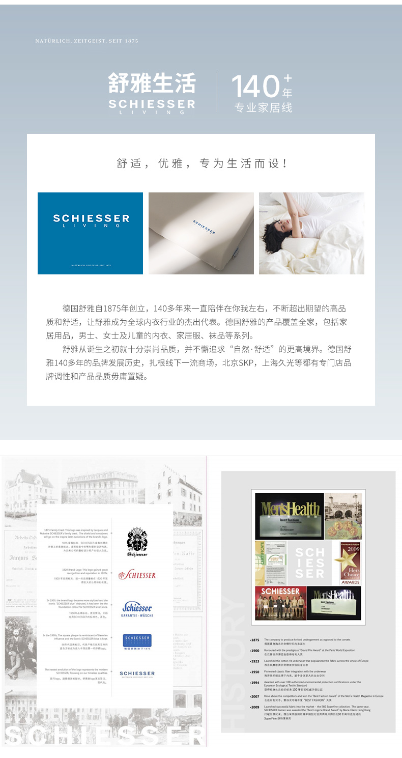 一个品牌是一种承诺,他面向顾客,面向未来。从创立伊始,SCHIESSER就被赋予了四个品牌价值:品质、天然、美观、时尚。一个品牌是一种承诺,他面向顾客,面向未来。从创立伊始,SCHIESSER就被赋予了四个品牌价值:品质、天然、美观、时尚。