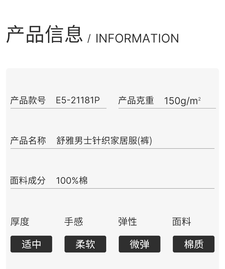 SCHIESSER舒雅23早春新品纯棉柔软亲肤宽松男士家居裤长裤E5/21181P